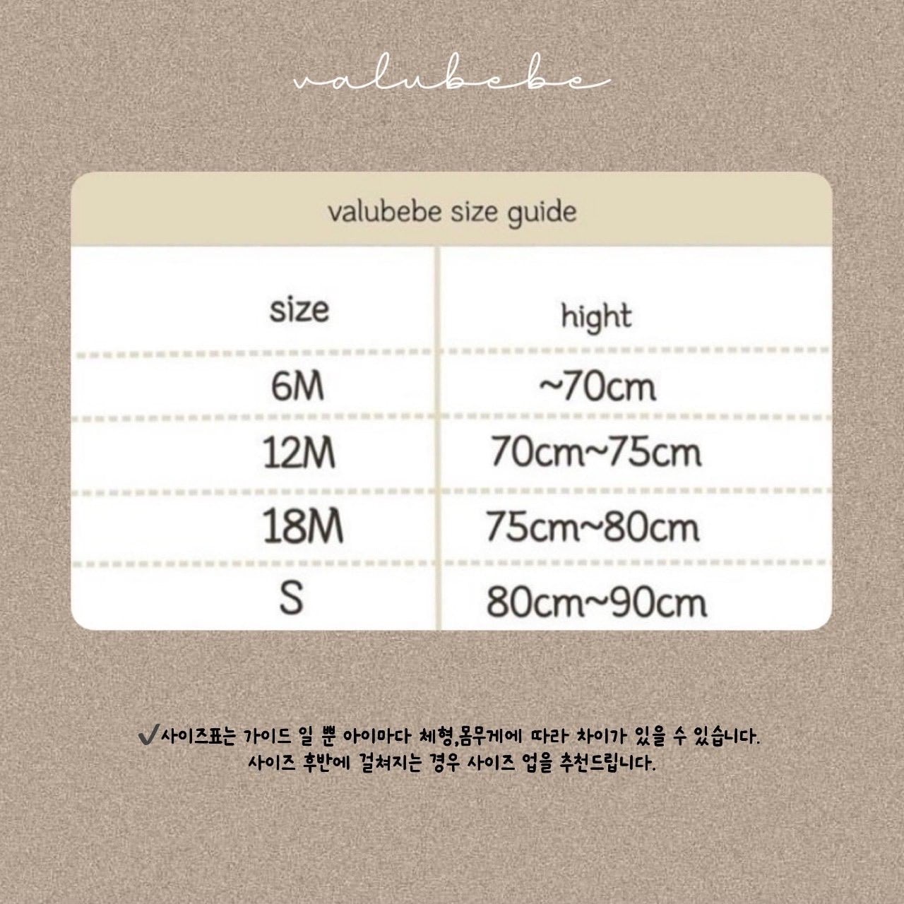 6M (-70cm) / 12M (70-75cm) / 18M (75-80cm) / S (80-90cm)